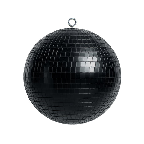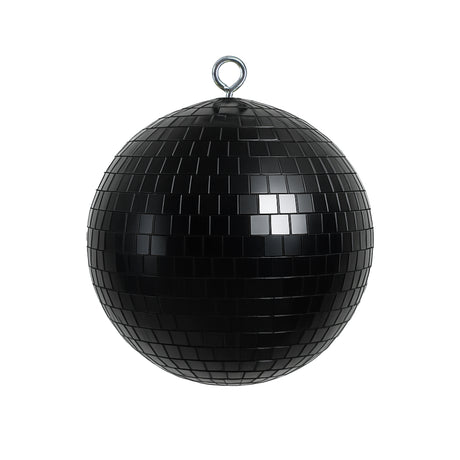 - Eine schwarze Spiegelkugel kombiniert die klassische Form mit einem dunkleren Look, der in eher puristischen oder dunklen Bühnen-Designs interessant sein kann.