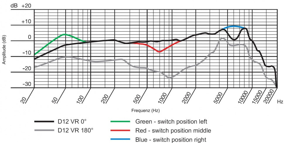 Das D12 VR bietet drei aktive Filtervoreinstellungen, um seine Klangform an den Charakter der Kick-Drum anzupassen. Bei Aktivierung wird der Ausgangspegel automatisch um 10 dB reduziert. Die Filtereinstellungen können über einen Schalter am Mikrofongehäuse gesteuert werden. Ohne Phantomspeisung arbeitet das Mikrofon im passiven Modus und liefert den reinen Klang der Instrumente.