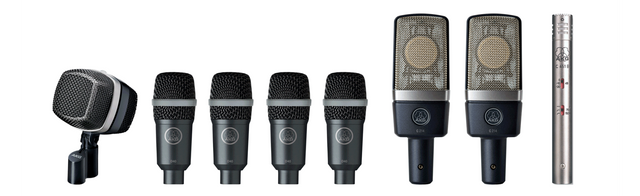 AKG Schlagzeug-Set Premium ist ein komplettes Mikrofonset mit Mikrofonen für Live-Auftritte und Studioaufnahmen. Die Mikrofone sind für die Tonaufnahme verschiedener Trommeln konzipiert.