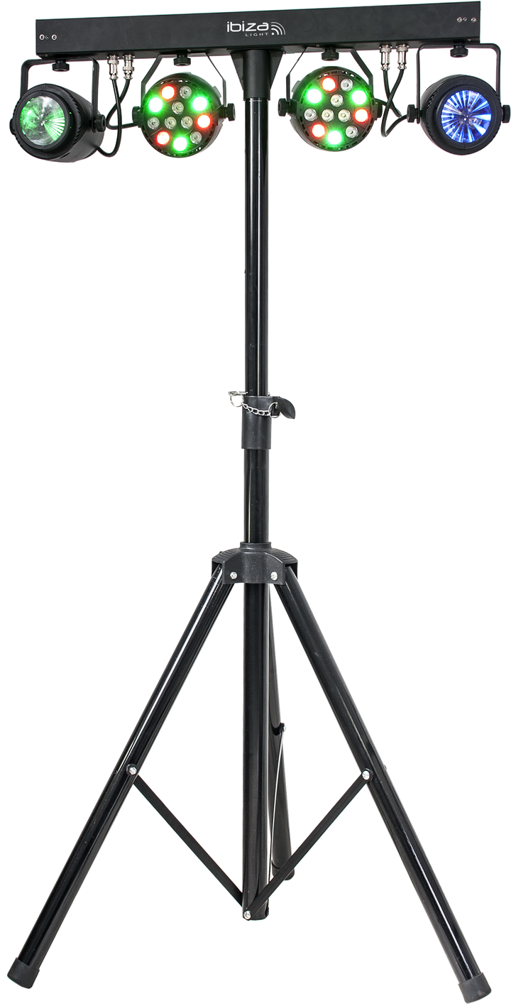Vollständige Lichtleiste einschließlich rutschfestem Ständer in schwarzer Ausführung für eine einfache Einrichtung. Das Set enthält 2x Paar Lampen mit 12x 1W RGBW LEDs und 2x Moonflower-Effekten RGBWA LEDs.