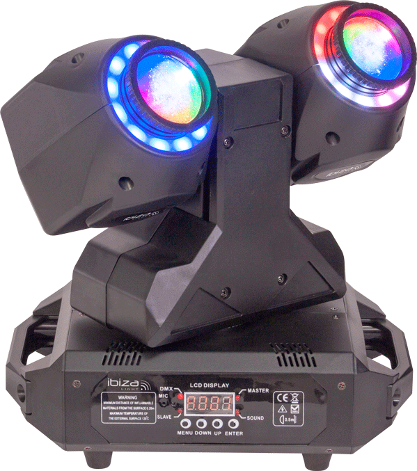 - Dieser duale Moving Head füllt den Raum mit besonders farbenfrohen Effekten, die von 2 x 12 RGB SMD5050 LEDs erzeugt werden, die den Wash-Effekt erzeugen, und 2 leistungsstarken 30W 4-in-1 RGBW LEDs, die den Beam-Effekt erzeugen.