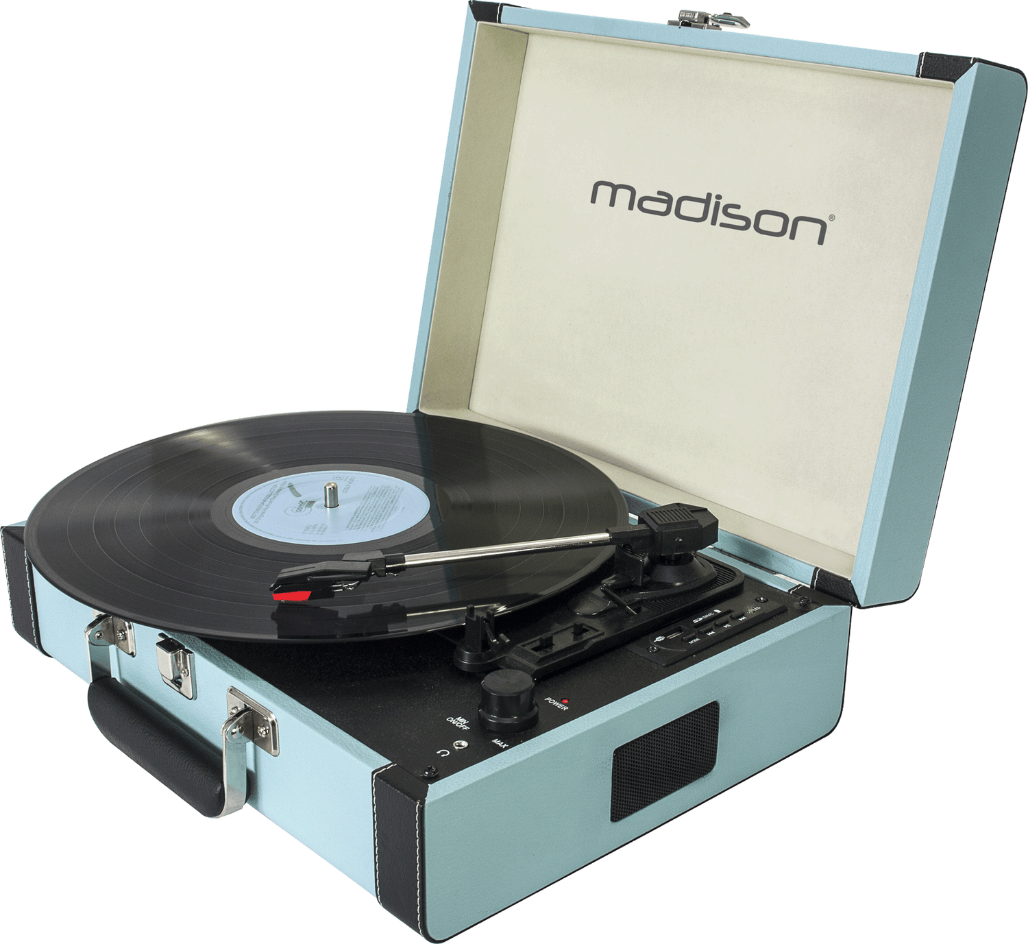 Coole hellblaue Plattenspieler im Retro-Look und Kofferde sign. Nehmen Sie den Spieler überall mit. Integrierte Lautsprecher sorgen für guten Klang ohne Mühe. Spielen Sie Musik von Bluetooth, USB und SD-Karte ab - Sie kommen nie ohne Musik aus. Nehmen Sie Ihre LPs auf USB und SD-Karte auf, damit Sie immer die knackigen Klänge der Schallplatte hören können. Ausgang für Kopfhörer. Abspielgeschwindigkeit 33/45/78 U/min.