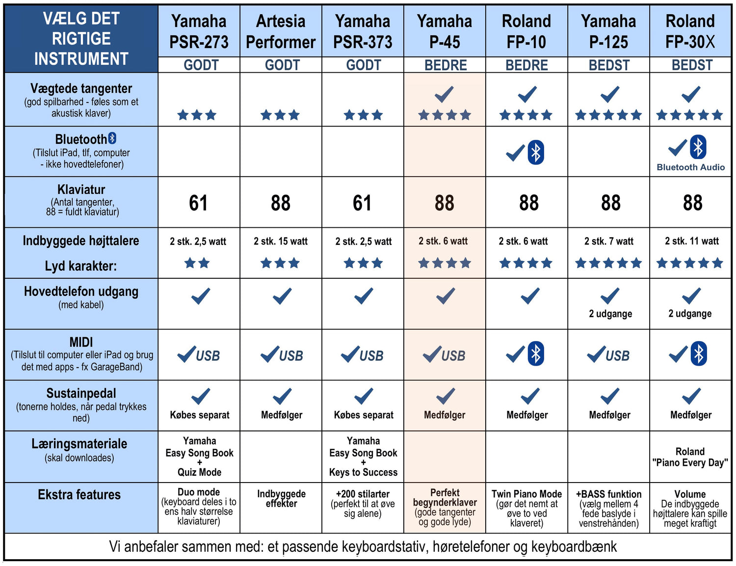 - Alles, was Sie zum Klavierspielen benötigen. Das P-45 ist ein großartiges Klavier mit gewichteten Tasten und hervorragender Spielbarkeit. Der mitgelieferte Ständer hat zwei Beine und steht auch mit einem P-45 darauf stabil.