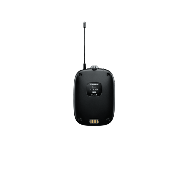Shures SLXD1 bodypack - transmitter gives you transparent high quality sound without cables. Digital UHF transmitter with up to 8 hours of battery life from 2 AA batteries. Easy pairing with recievers over IR scan and sync, with 100m range