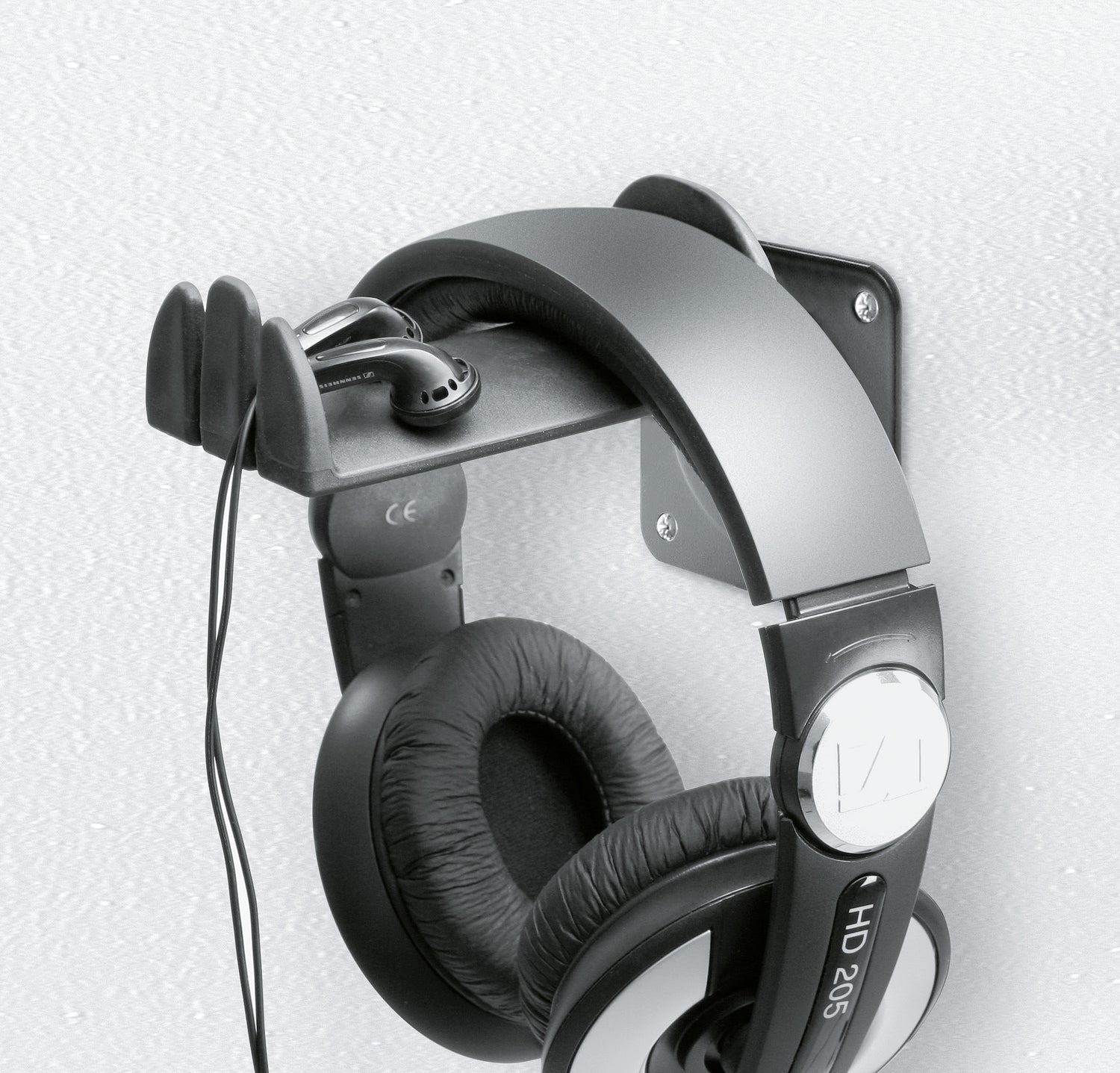 - Die Halterung bietet Platz für zwei Standard-Kopfhörer.