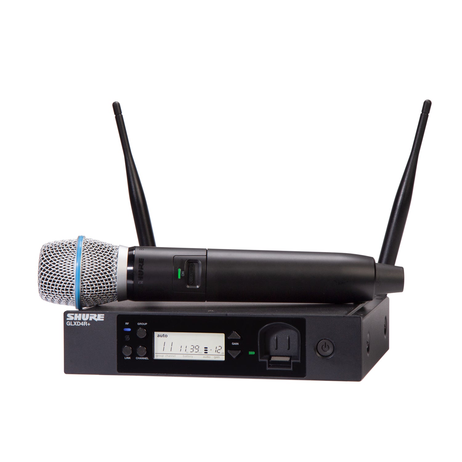 - Beta87A condenser vocal microphone with built-in transmitter and GLXD4R+ half-rack receiver.