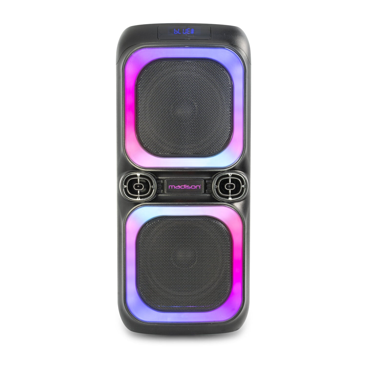 - Zwei quadratische LED-Lichteffekte rund um die Woofer.