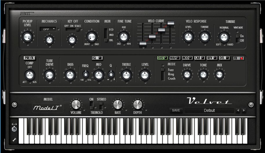 Velvet ist ein virtuelles E-Piano, das fünf legendäre E-Pianos der 60er und 70er Jahre in einem vielseitigen Instrument vereint. Basierend auf dem Fender Rhodes Suitcase, den Fender Rhodes MK I und MK II Stage Pianos, dem Wurlitzer 200A und dem Hohner Pianet-T emuliert Velvet präzise Klangqualität, Ansprache und Nuancen jedes Originalinstruments und erweckt so Ihre Piano-Tracks zum Leben.