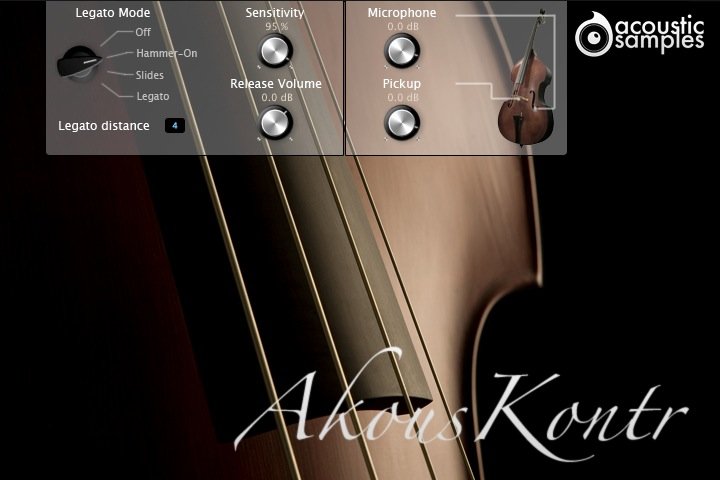 Der AkousKontr ist ein deutscher 4/4-Kontrabass mit vier Saiten. Acoustic Samples nahm beide Tonabnehmer mit einem Paar elektrostatischer Mikrofone auf.