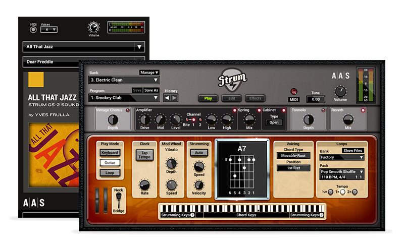 By combining Strum GS-2's Guitar, Keyboard, and Loop modes along with preset variations, your jazzy guitar parts are covered. The All That Jazz sound pack showcases jazz' foundations with its up-tempo funky strumming pattern rhythms. Give it a try on your next hip jazz combo charts or your complex swinging big band arrangements.