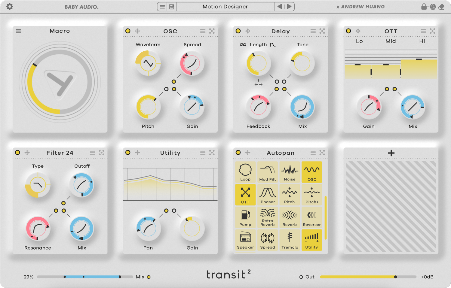 Transit 2 ist das nächste Kapitel in der kreativen Zusammenarbeit zwischen Baby Audio und Andrew Huang. Neben der Tatsache, dass Andrew einer der meistverfolgten Musikproduzenten der Welt ist, hat sein tiefes Verständnis für Musiktechnologie ihn zu einem wertvollen Partner bei der Entwicklung des Plugins gemacht. Wir haben auf Andrews Experteneinblicke und aufregende neue Ideen zurückgegriffen, um Transit 2 noch besser als das Original zu machen.