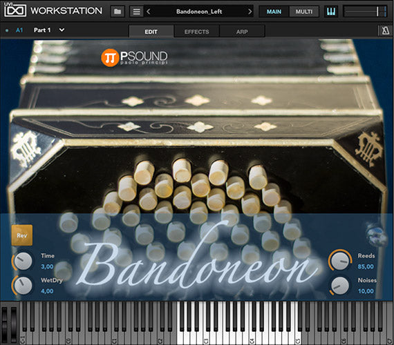 Bandoneon besteht aus einer philologischen Reproduktion eines historischen Alfred Arnold Bandoneons, das in den 50er Jahren in Deutschland hergestellt wurde! Sein typischer Klang basiert auf 2 Reeds (Zink) für jede Note. PSound Bandoneon wurde in 4 Schichten mit 2 Round Robin gesampelt, insgesamt 440 Samples (1 GB Speicher)