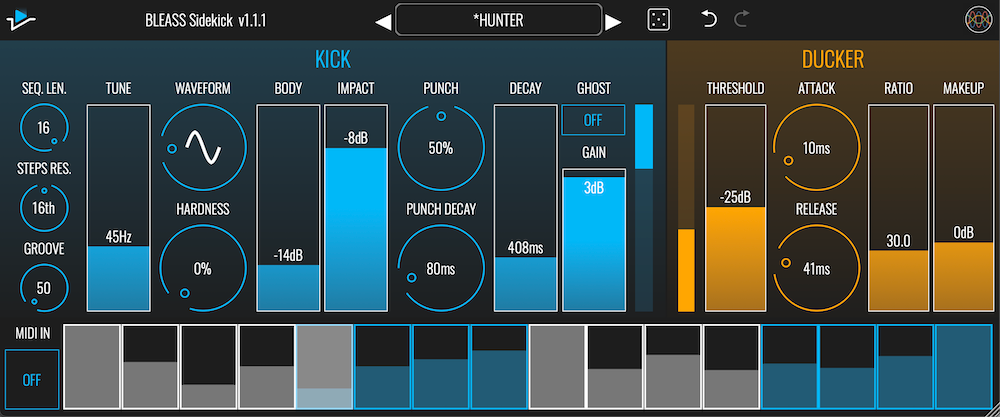 BLEASS Sidekick ist ein vielseitiges Plugin, das einen Kickdrum-Synthesizer, einen 16-stufigen Sequencer und einen Ducker für dynamische Sidechain-Effekte kombiniert. Sein analoger Kick-Engine, inspiriert von Vintage-Beatboxen, erzeugt druckvolle, basslastige Kicks, die mit dem Eingangssignal gemischt oder an einen separaten Buskanal für weitere Verarbeitung geleitet werden können.