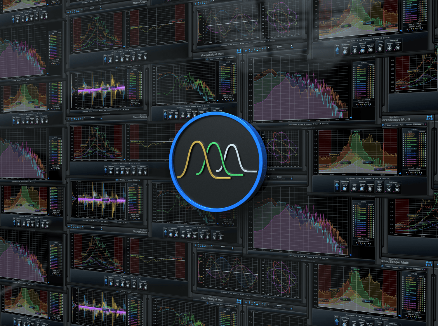 Blue Cat's FreqAnalyst Multi Plugin bietet eine extrem glatte Analyse des Spektrums und des Frequenzinhalts, der Blue Cat's StereoScope Multi Analyzer ermöglicht es Ihnen, das Stereo-Bild Ihres Audioinhalts im Detail zu visualisieren, und der Blue Cat's Oscilloscope Multi Wellenform-Viewer zeigt die Wellenform von Audiosignalen sowie deren Phasenbeziehung.