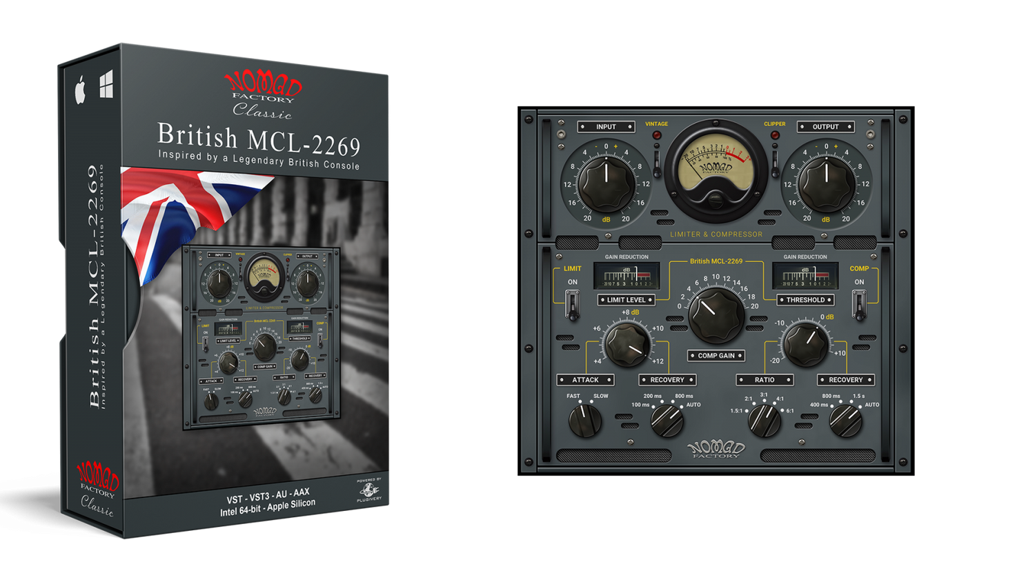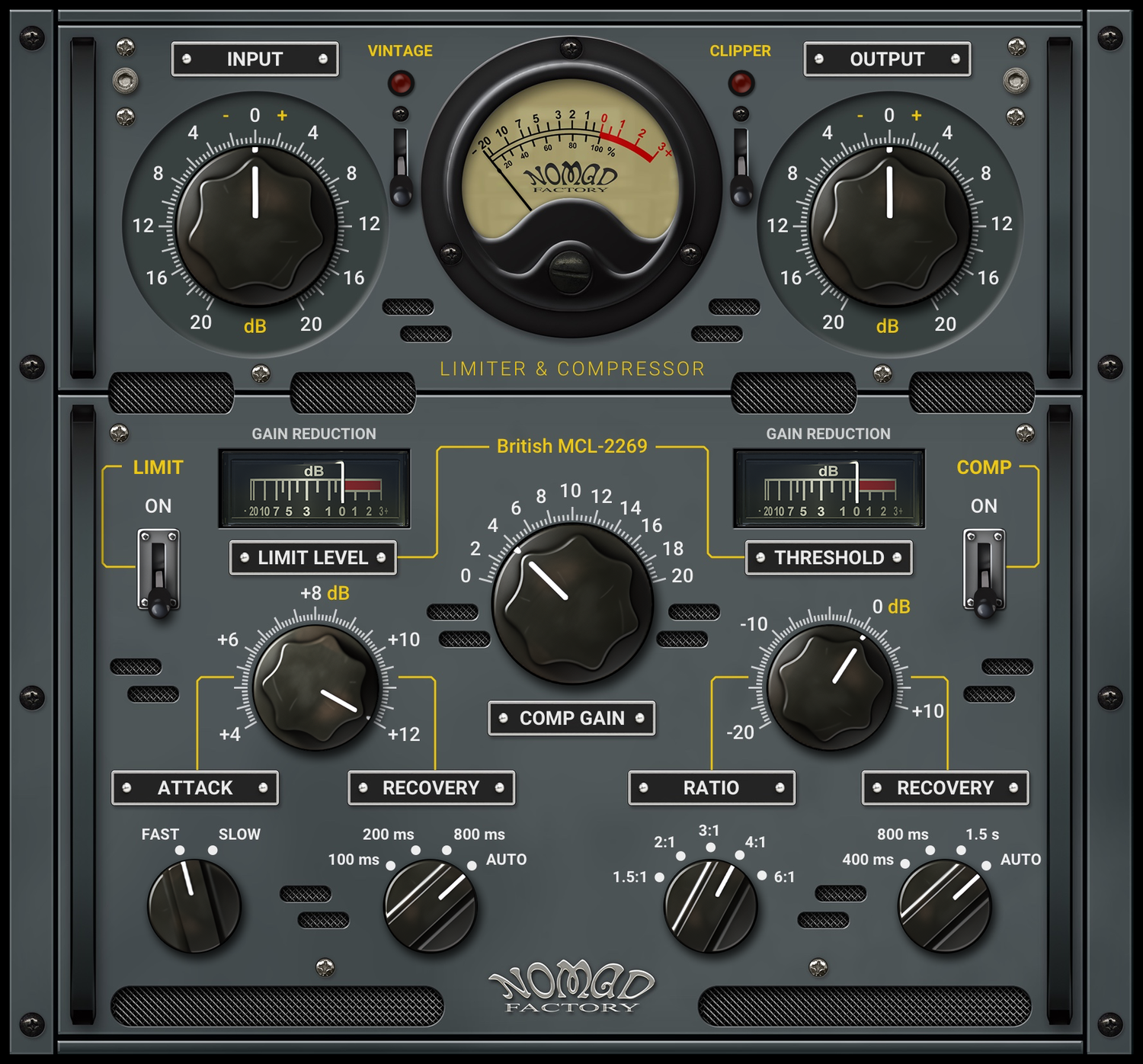 Der Nomad Factory MCL-2269 Compressor Limiter ist vom legendären 2254 Compressor eines berühmten britischen Mischpults inspiriert. Er liefert dieselbe warme, musikalische Kompression, die unzählige Hits geprägt hat.