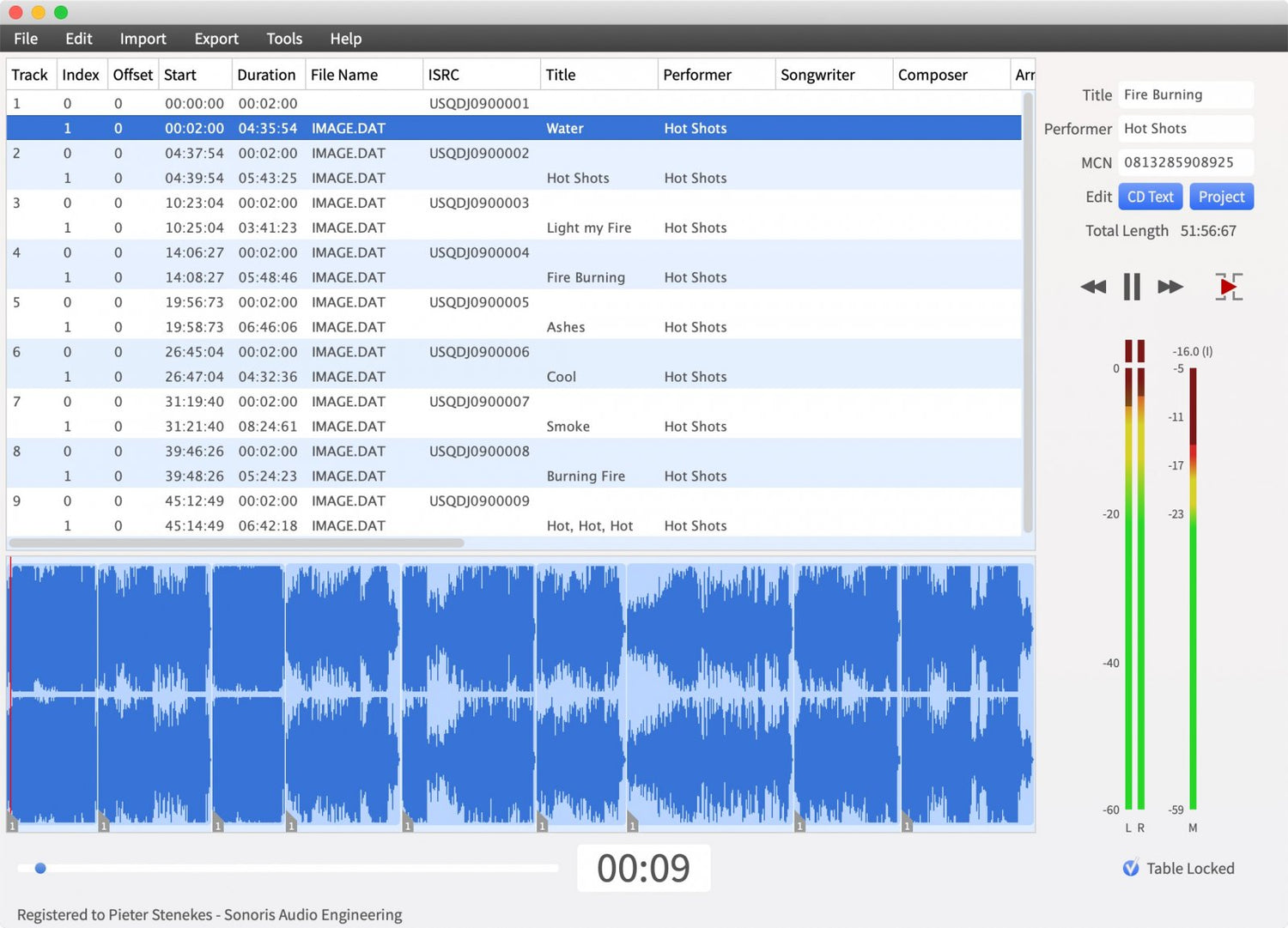 With the DDP Creator you can assemble a RedBook compatible CD by just dropping mastered 16 bit wav or aif files on the workspace and set the track order. After that you can adjust the spaces between tracks and audition this by playing back the transition from one track into another. Then edit the PQ points, ISRC, MCN and CD-Text data. Finally export to DDP, Cue Sheet or CD and print a PQ sheet if needed.