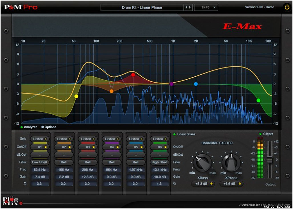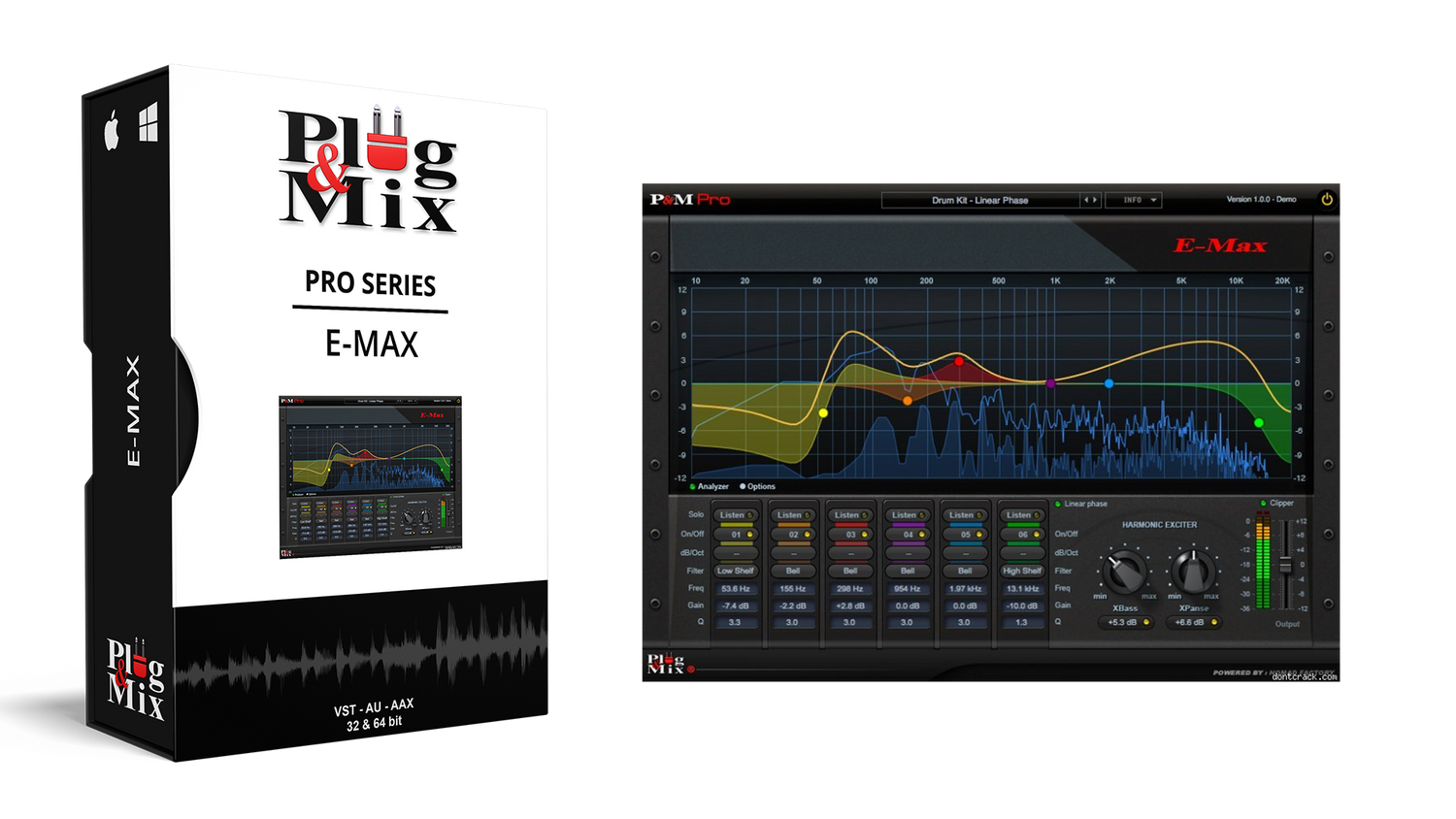 P&M E-Max Equalizer provides the highest quality tool for sculpting your sound with a stunning new interface for precise control. E-Max goes beyond the expectations of a normal EQ with its built in Harmonic Exciter for extra “sweetening” and a Linear Phase mode for mixing & mastering which preserves the transients and transparency of your music.