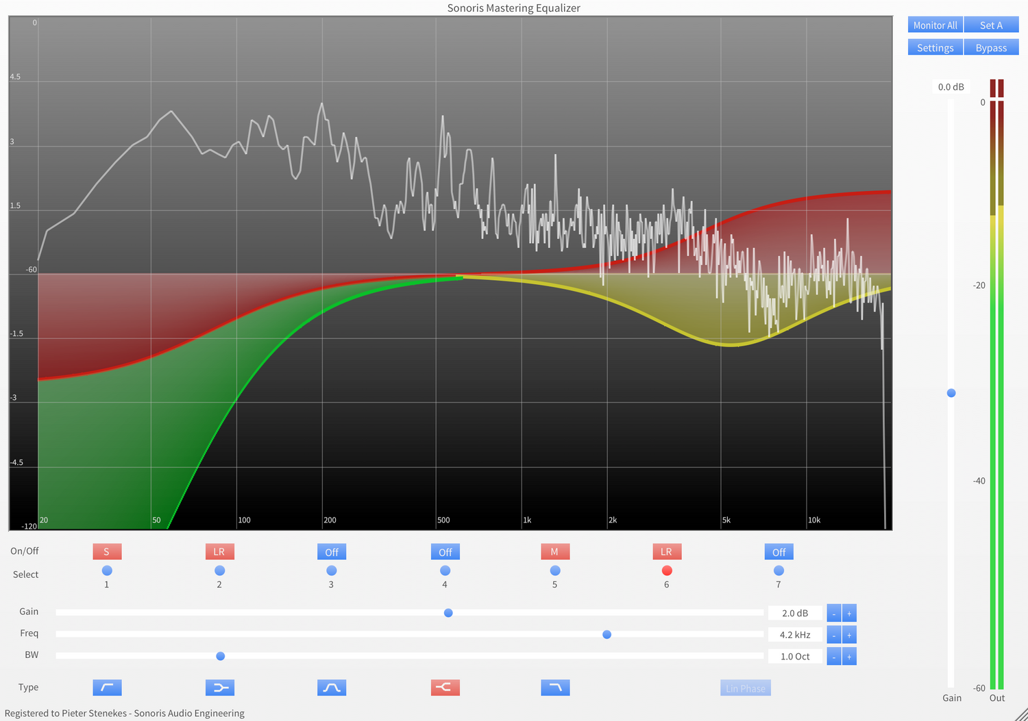 The Sonoris Mastering Equalizer (SMEQ) is a parametric equalizer in VST, VST3, AU, AAX and RTAS format for Windows and Mac. It has selectable linear phase or minimum phase operation per band. The plugin is suitable for mixing and especially mastering and features 7 bands, including lowpass, highpass, peaking and shelving filters.