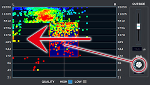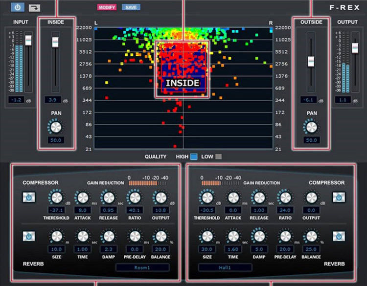 F-REX kann den in Echtzeit abgespielten Sound in die drei Parameter 'Gain', 'Frequency' und 'Panning' analysieren und grafisch visualisieren.