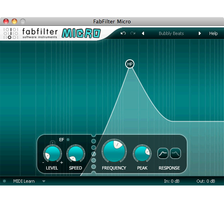 Der einzelne Filter von FabFilter Micro ist sanft und cremig, verwandelt sich jedoch leicht in rohe Sättigung und Selbstoszillation, wenn er mit dem interaktiven Filterdisplay angepasst wird. Er bietet Tiefpass- und Hochpassformen sowie einen Hüllkurvenfolger zur Modulation der Cut-off-Frequenz.