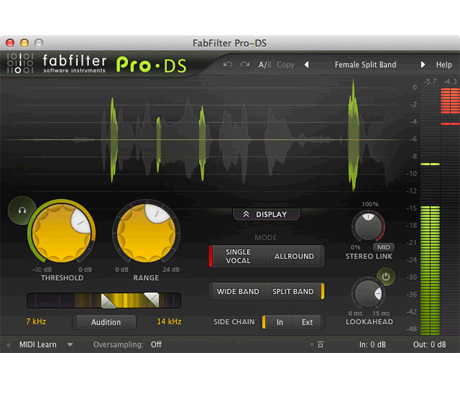 FabFilter Pro-DS bietet alles, was Sie benötigen, um das bestmögliche Ergebnis zu erzielen, präsentiert in einer einfachen und benutzerfreundlichen Oberfläche. Breite Band- oder linear-phasengeteilte Verarbeitung, eine optionale Vorlaufzeit von bis zu 15 ms, anpassbare Stereo-Verlinkung mit optionaler Mid-only oder Side-only Verarbeitung, bis zu viermal linear-phasige Oversampling... das ist alles vorhanden.
