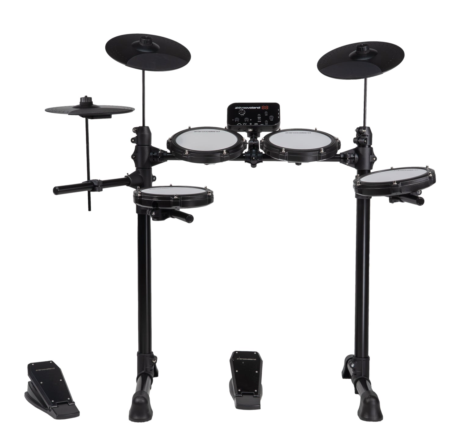 Das ED100 verfügt über separate Pedale für Hi-Hat und Bassdrum sowie über Single-Trigger-Pads an allen Drums und Becken. Dank USB-MIDI können Aufnahmen gemacht oder externe virtuelle Drums am Computer verwendet werden. Kopfhörerausgang und Audioeingang ermöglichen leises Üben mit Hintergrundmusik.