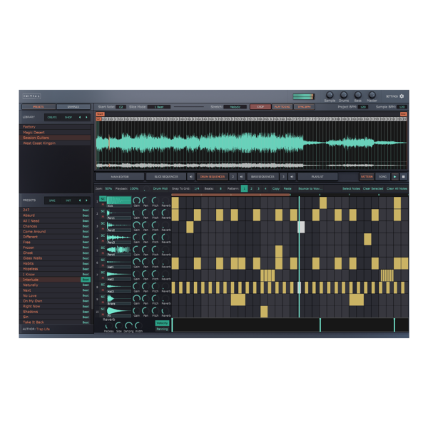 Initial Slice ist ein Loop-Slicer und Beat-Making-Plugin. Laden Sie Audio-Loops per Drag & Drop, um sie zu schneiden, zu loopen, umzukehren, die Tonhöhe zu ändern oder sogar zeitlich zu dehnen. Initial Slice kommt auch mit mehreren integrierten Piano-Rollen, sodass Sie Sequenzen direkt im Plugin erstellen können. Darüber hinaus haben wir einen fortschrittlichen Drum-Sequencer, Bass-Sequencer, Playlist-Editor, 4 Effekt-Racks (jeweils mit 11 integrierten Effekten) und viele hochwertige Inhalte.