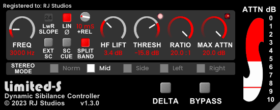 Limited-S ist ein De-Esser vom Typ „fester Schwellenwert“, der auf Spitzenpegeln des Signals arbeitet, ähnlich wie ein Limiter. Er versucht nicht, das Gesamtsignal zu verfolgen und das zu dämpfen, was er für übermäßige Sibilanz „hält“. De-Esser dieser Art neigen dazu, die führende Sibilanz übermäßig zu komprimieren (was Lispeln erzeugt), während sie die nachfolgende Sibilanz unter Kontrolle halten. Limited-S hingegen erfasst nur die lautesten und störendsten Sibilanzspitzen. (Der Schwellenwert kann automatisiert werden, wenn gewünscht). Bei Verwendung auf Stereo-Tracks kann Limited-S auf dem gesamten Mix, nur auf den Mitten, nur auf den Seiten oder nur auf Links oder Rechts arbeiten. Dies ermöglicht Anwendungen sowohl im Mixing als auch im Mastering, wie z.B. das De-Essen von Vocals in einem Master (typischerweise zentriert), während die Seiten unberührt bleiben. Die High Lift-Steuerung von Limited-S ermöglicht es, Helligkeit zu einem Mix hinzuzufügen, während gleichzeitig übermäßige hohe Frequenzen kontrolliert werden. Großartig für Vocals oder um ein Master aufzuhellen.