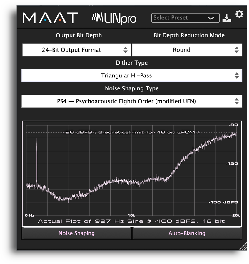 Mit derselben Benutzeroberfläche sind die zwei Kanäle und Multikanal LIN-Familie von MAAT Ihre letzte Verbindung zwischen Produktion und Lieferung. LIN bietet optionale Wortlängenreduzierung und sieben rauschformende Spektren, die sowohl für die analoge als auch für die digitale Lieferung von Inhalten maßgeschneidert sind, und ist hochgradig anpassbar, um Ihren eigenen charakteristischen „Sound“ zu kreieren. Neben TPD und gewichtetem TPD bieten LINpro und LINSurround vier neu entwickelte psychoakustische Rauschformungsoptionen fünfter, achter und neunter Ordnung. Wie bei allen Dithering-Mechanismen muss LIN die allerletzte Plug-in-Instanz sein, kurz bevor die Umwandlung in das endgültige, feste Punktformat erfolgt.