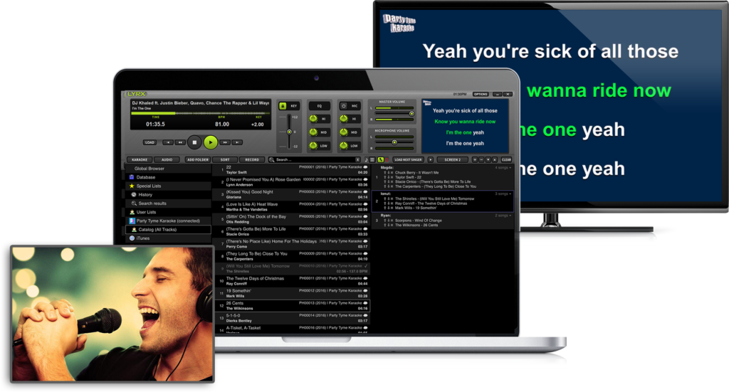 LYRX definiert traditionelle Karaoke-Show-Hosting-Software neu. Modern und flott, umfasst LYRX eine Vielzahl von Funktionen, um das Hosting von Karaoke einfacher und angenehmer zu gestalten. Mit Unterstützung für traditionelle Karaoke-Formate und Video, verwalteter Sängerrotation und -historie, Fernanfragen für Sänger/Lieder, Tonartenerkennung und mehr - LYRX enthält alle Funktionen, die ein KJ benötigt, um präzise zu performen. Der robuste Browser kann mehr als 1 Million Tracks mit Suchfunktion während der Eingabe verwalten. Nutzen Sie das integrierte Party Tyme Karaoke-Abonnement, um auf eine kommerziell legale Bibliothek von HD-qualitativen Karaoke-Songs zuzugreifen, oder importieren Sie Ihre eigene Karaoke-Sammlung und kaufen Sie Tracks im integrierten PartyTyme.net-Shop, während Sie fortfahren. Jetzt wird der Karaoke Cloud Pro-Service von Digitrax Entertainment unterstützt, der KJs eine weitere legale Karaoke-Abonnementoption bietet. LYRX ist die beste Karaoke-Softwarelösung für den heutigen arbeitenden KJ.