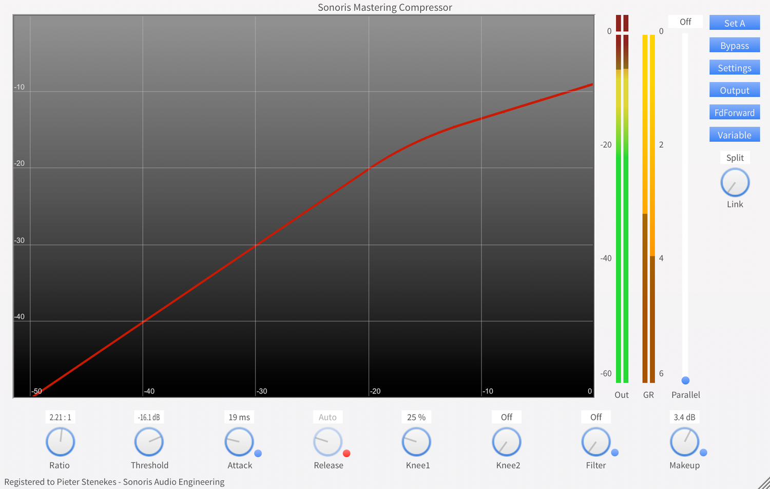 The Sonoris Mastering Compressor (SMCP) is a wideband mastering compressor in VST, VST3, AU, AAX and RTAS format for Windows and Mac. It is an ultra clean compressor suitable for delicate material. No odd harmonic distortion that can be found in most compressors is present in the SMCP. To reduce residual artifacts the SMCP features upsampling of the audio up to 8 times. Transparency can be further enhanced by selecting auto-release and feedback detection together with two soft knees.