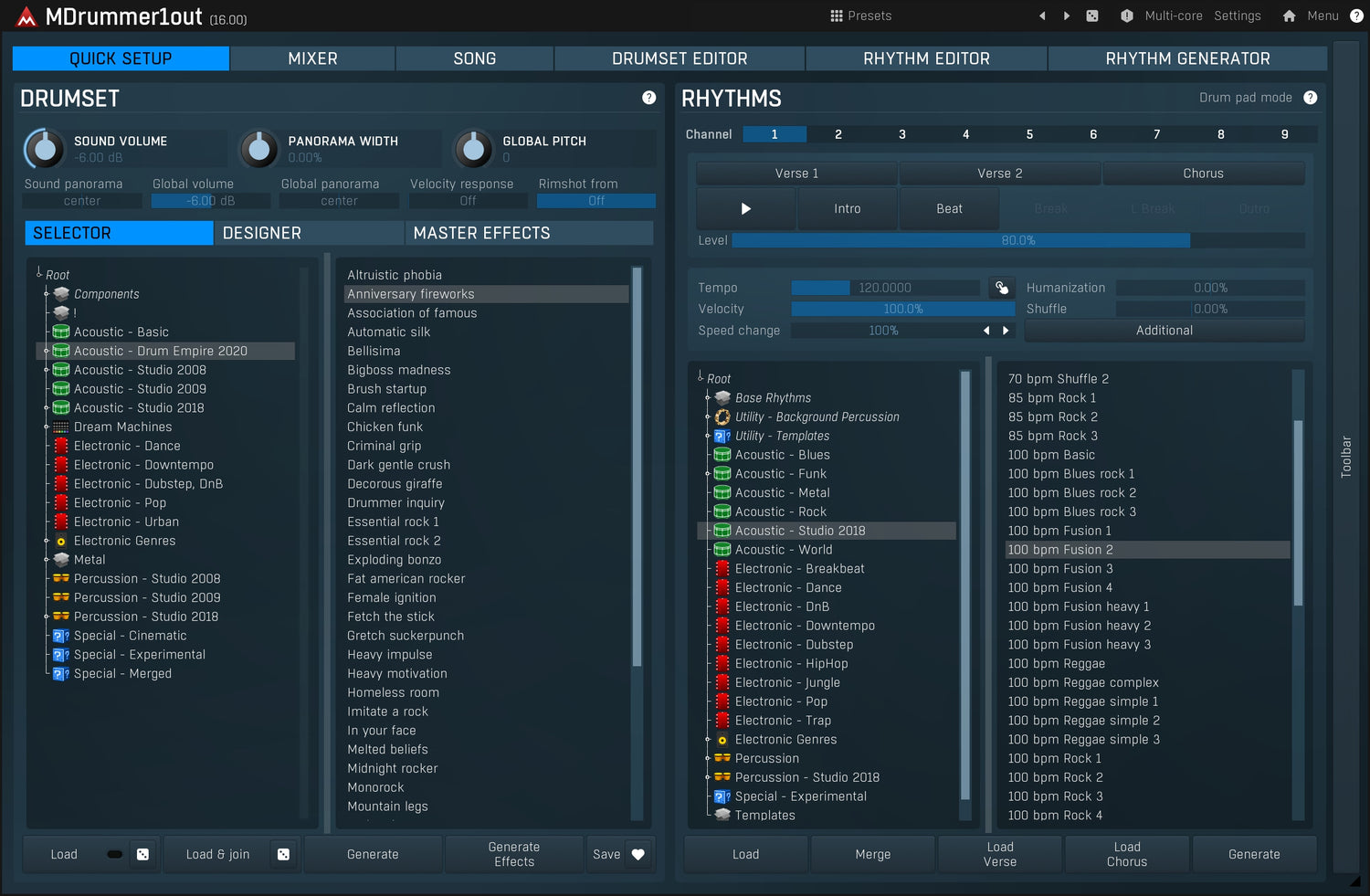 MDrummer versteht wirklich, was ein Rhythmus ist, auf die gleiche Weise, wie es Menschen tun, und Sie haben Zugang zu allem, was es weiß. Es kann jeden Stil und jedes perkussive Instrument abdecken. MDrummer kann Pop, Drum'n'Bass, Rock, R'n'B, Salsa, Jungle, Jazz, Rumba auf Congas, Progress-Metal im 11/4-Takt spielen... alles, was Sie sich vorstellen können. MDrummer kann neue Rhythmen für Sie generieren, mehrere Rhythmen zusammenführen, Shaker und andere Hintergrund-Percussion hinzufügen. Humanisierung, Shuffle, halbes/doppeltes Tempo & Gefühl und viele weitere fortgeschrittene Funktionen lassen Sie Ihre Ideen mit ein paar Mausklicks in die Realität umsetzen.
