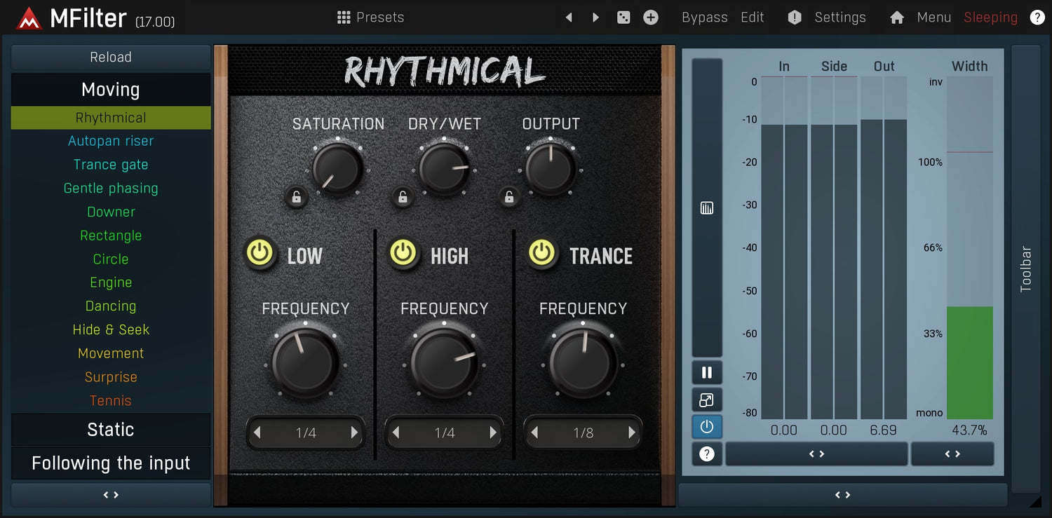 Wann immer Sie Bewegung zu einem ansonsten statischen Klang hinzufügen müssen, ist ein Filter einer der ersten Prozessoren, die Sie ausprobieren sollten. MFilter kann wahrscheinlich mehr, als Sie sich vorstellen können, was ein Filter leisten kann.
