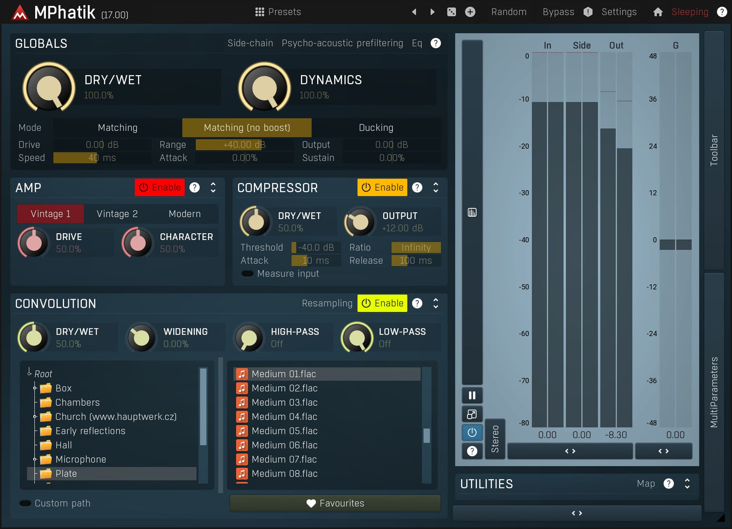 MPhatik ist mit einem leistungsstarken Amp-Simulator, Convolution-Reverb (mit allen Arten von Impulsantworten von Plattenhall bis zu Hallen, Räumen usw., oder natürlich Ihren eigenen IR-Dateien) und einem Kompressor ausgestattet. Wenn das nicht genug ist, können Sie auch den Side-Chain-Eingang verwenden, um MPhatik zu steuern und das Audio mit Ihren eigenen Werkzeugen zu verarbeiten, während MPhatik die Dynamik wiederherstellt.