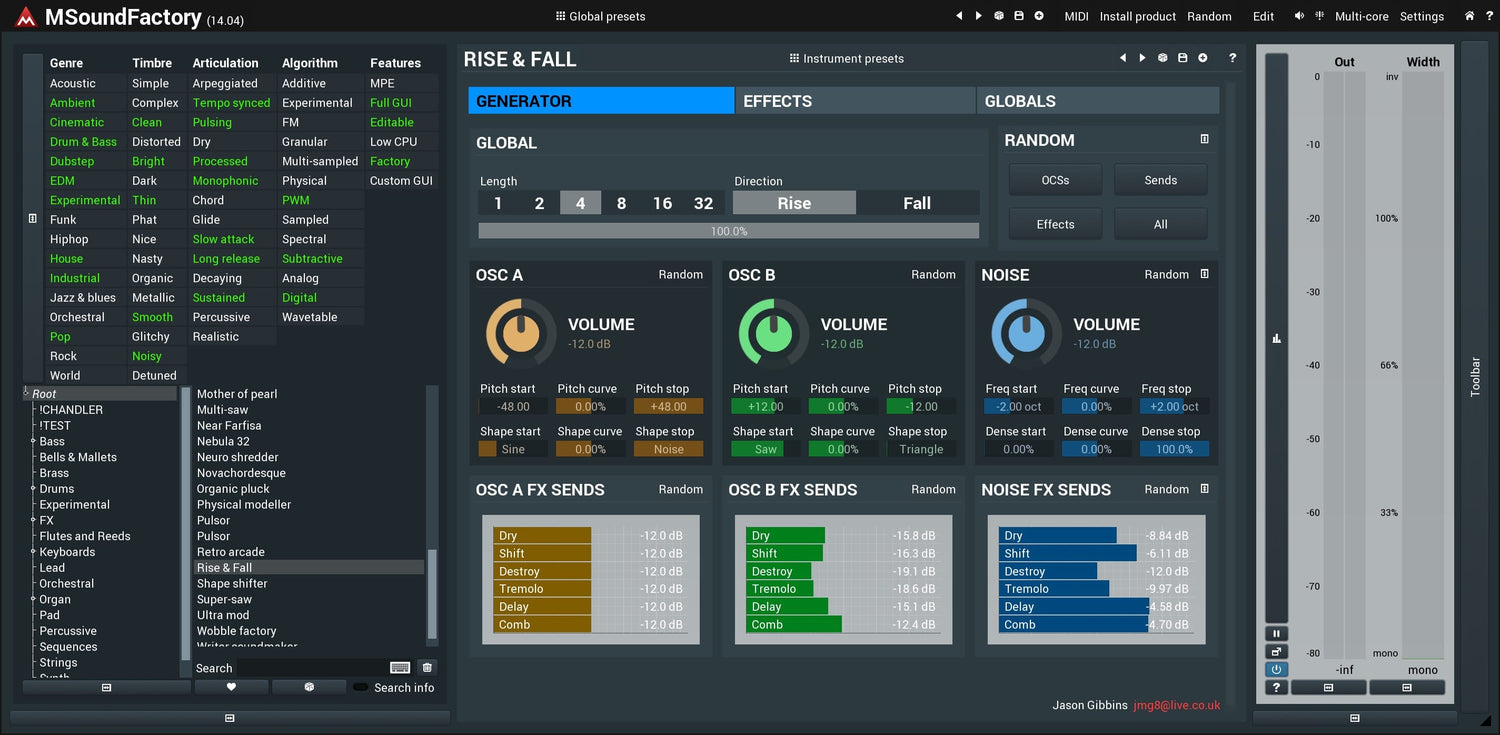 MSoundFactory bietet Hunderte von vordefinierten Klängen, die über globale Presets verfügbar sind, genau wie jedes andere Instrument. Das wahre Wunder ist jedoch das kategorisierte System von Instrumenten. Ein Instrument ist nicht nur ein Klang, möglicherweise mit ein paar Makrosteuerungen. Es ist ein ganzes "Instrument", mit vielen Einstellungen und eigenen Presets.