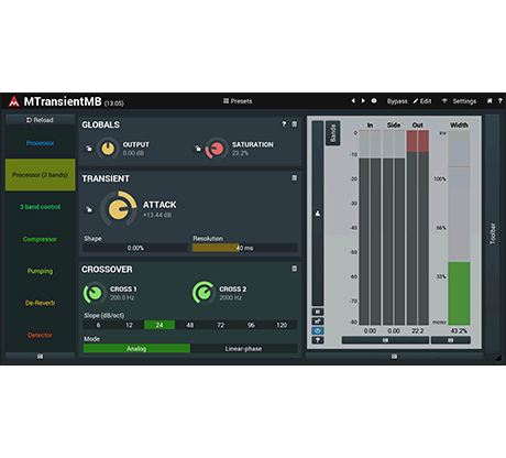 Wenn Ihre Drums langweilig und steril klingen, kann es schwierig oder zeitaufwendig sein, dies zu beheben. Jetzt gibt es eine Lösung. Bringen Sie Angriff und Punch in jeden rhythmischen Track mit MTransientMB! Seine Multiband-Natur macht die Bearbeitung der gesamten gemischten Drums zum Kinderspiel!