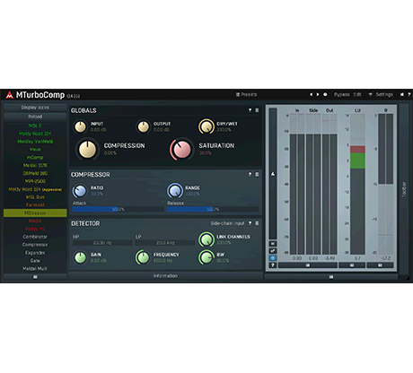MTurboComp ist der ultimative (nicht nur) Kompressor, der die meisten klassischen Vintage-Analogs-Kompressoren emuliert. Unglaublicher Klang, einzigartig schneller Workflow, eine Menge zusätzlicher Funktionen. Und Sie können damit Ihre eigenen Super-Kompressoren entwerfen!