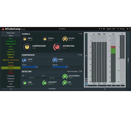 MTurboComp ist der ultimative (nicht nur) Kompressor, der die meisten der klassischen Vintage-Analogs-Kompressoren emuliert. Unglaublicher Klang, einzigartig schneller Workflow, eine Menge zusätzlicher Funktionen.