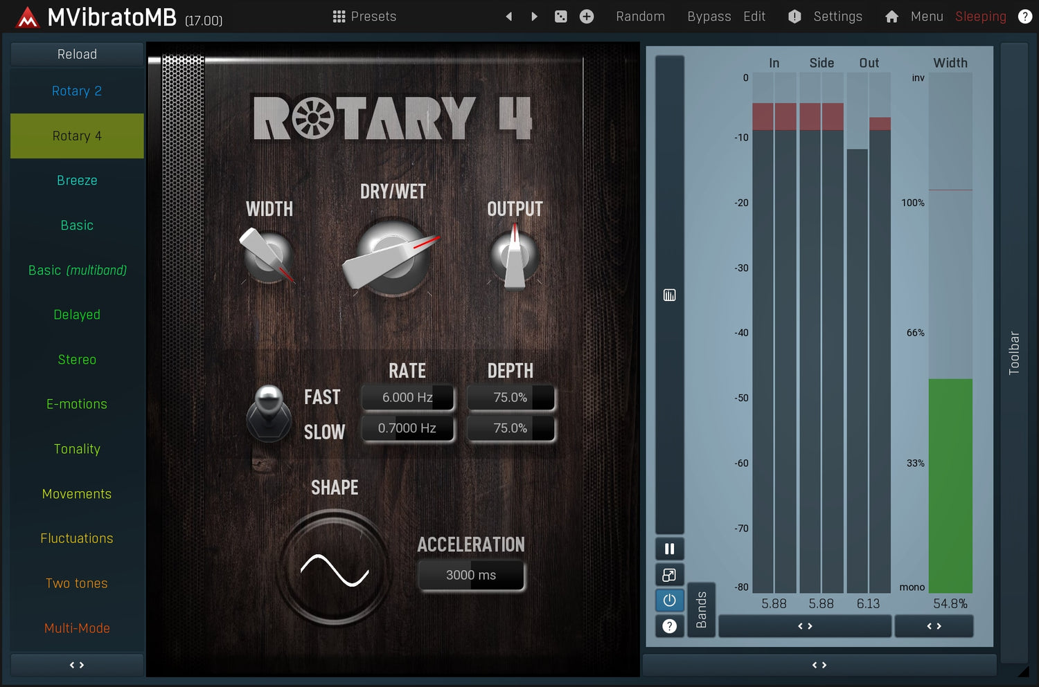 MVibratoMB kombiniert den Vibrato-Effekt mit einem Tremolo und einem Multiband-Design. Dies bietet genug Leistung, um eine 2-Lautsprecher-Rotary-Simulation aufzubauen, wie den berühmten Leslie-Lautsprecher. Aber warum dort aufhören, wenn man eine 6-Band-Rotary haben kann! Mit bis zu 16x Upsampling und Sinc-Interpolation ist MVibratoMB einfach der am besten klingende Rotary-Simulator auf dem Markt.