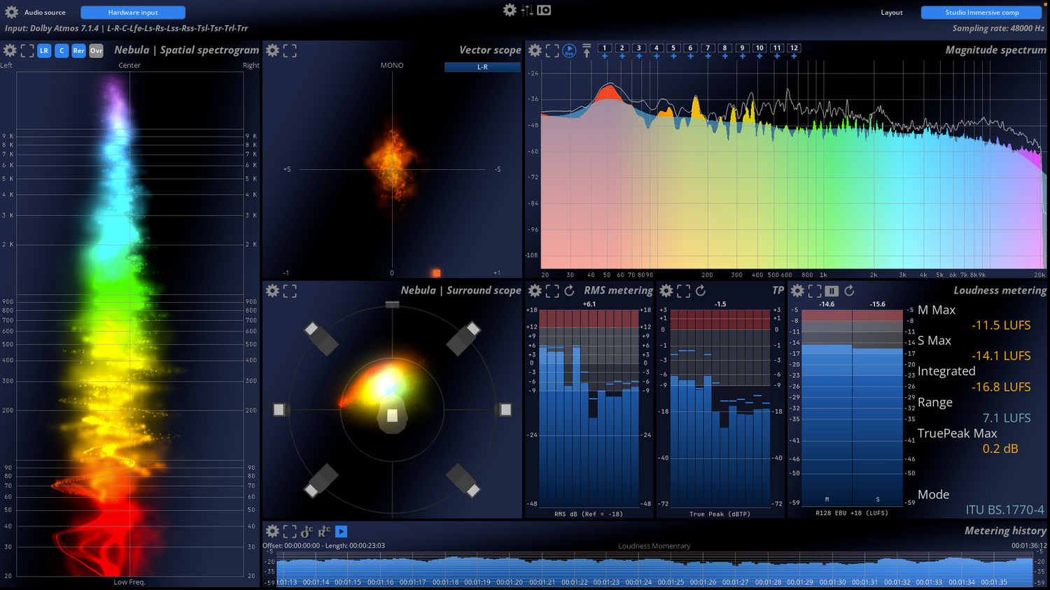 Der einzigartige FLUX:: Nebula visualisiert das räumliche Klangfeld in einem Scope-Spektrogramm zur Mehrkanalanalyse mit bis zu 24 Kanälen.