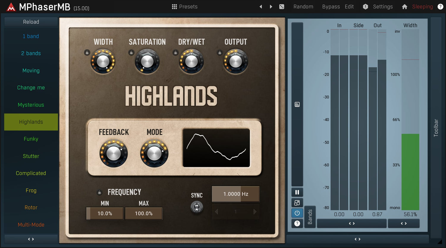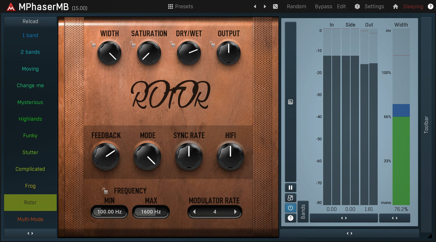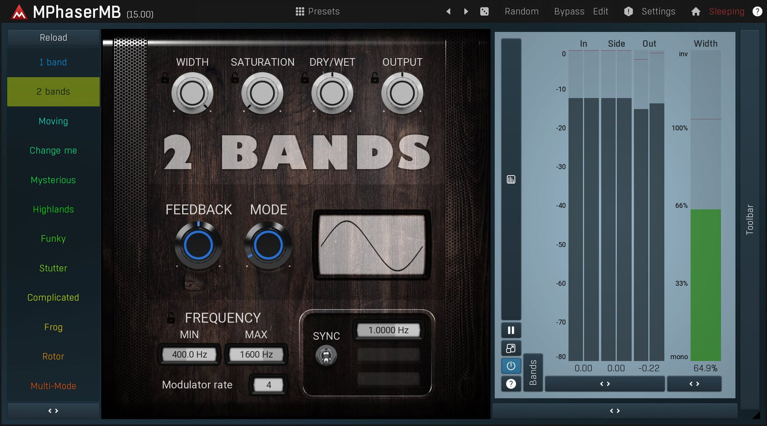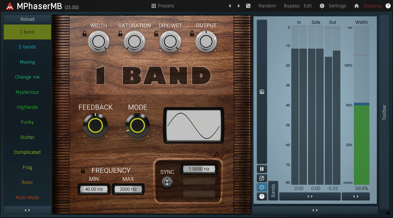 Phasers are commonly used on keyboards, guitars and other instruments to bring some movement and spatialization. MPhaserMB is an extremely versatile and musical-sounding phaser, which is perfect for all kinds of audio material.