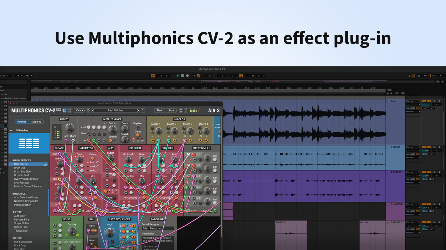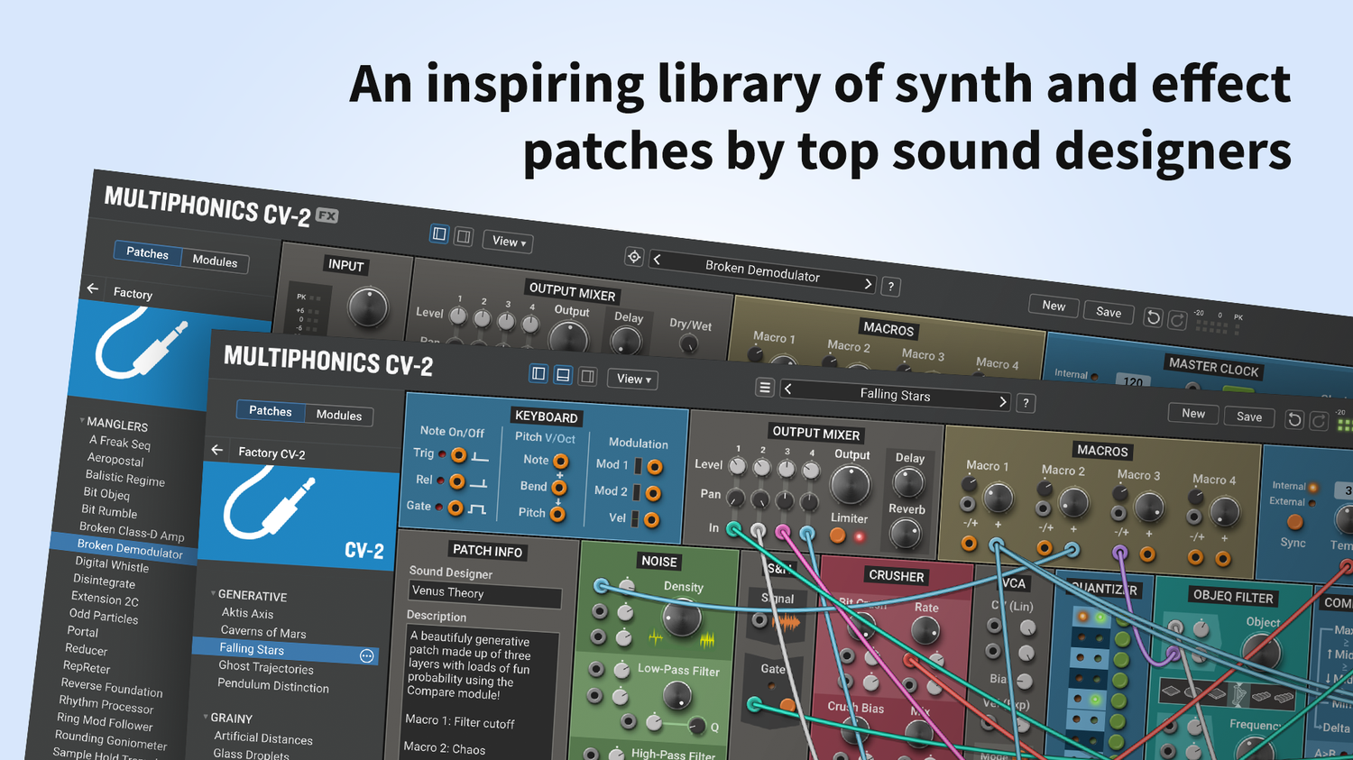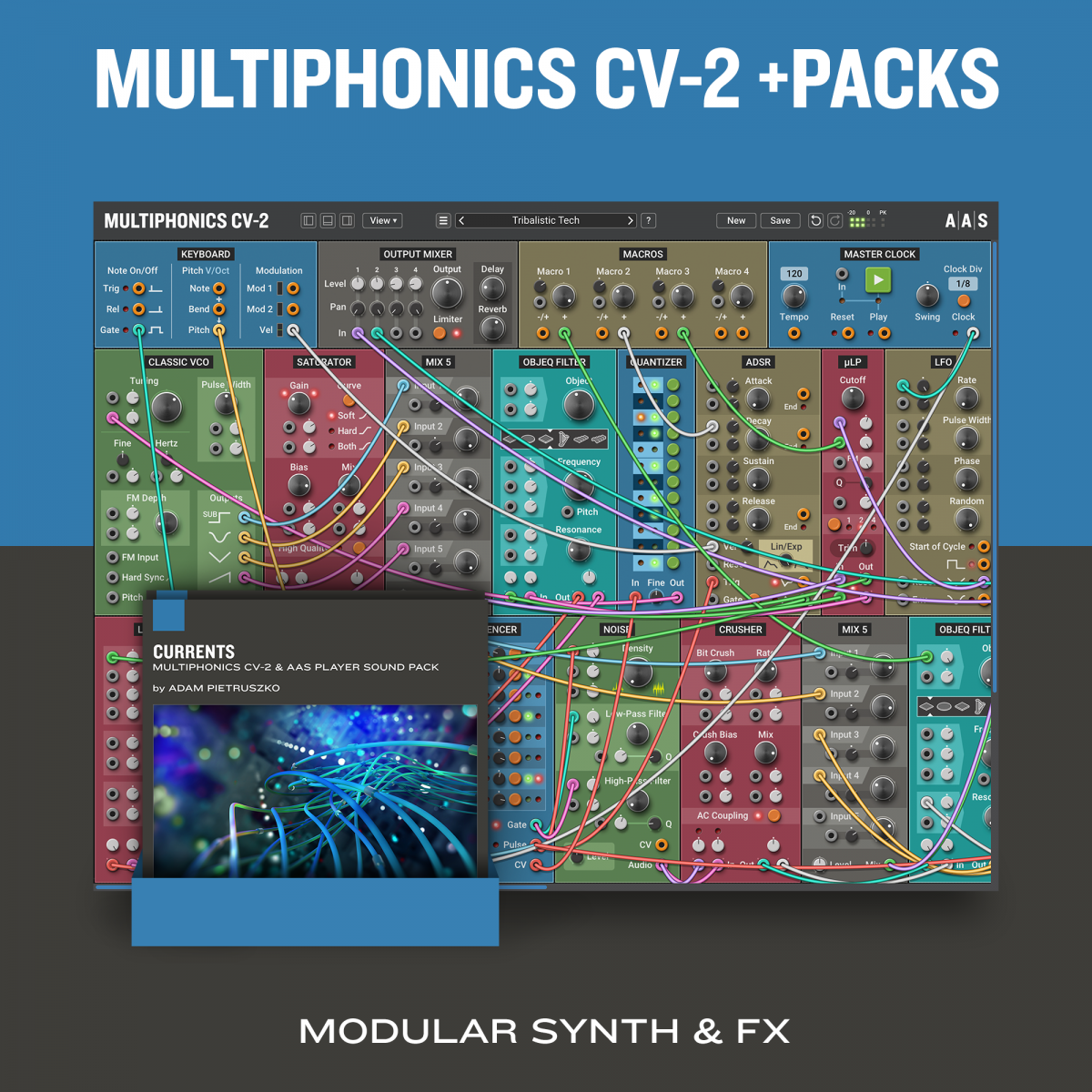 Multiphonics CV-2 is a versatile modular platform for assembling and playing patches. With a simple and straightforward interface, Multiphonics is a fast and efficient creation tool for musicians and sound designers. It is also a great learning environment for newcomers. At the core of Multiphonics is a comprehensive library of modules, from the basics to unique and sophisticated originals, and a vast and inspiring library of patches crafted by top sound designers.