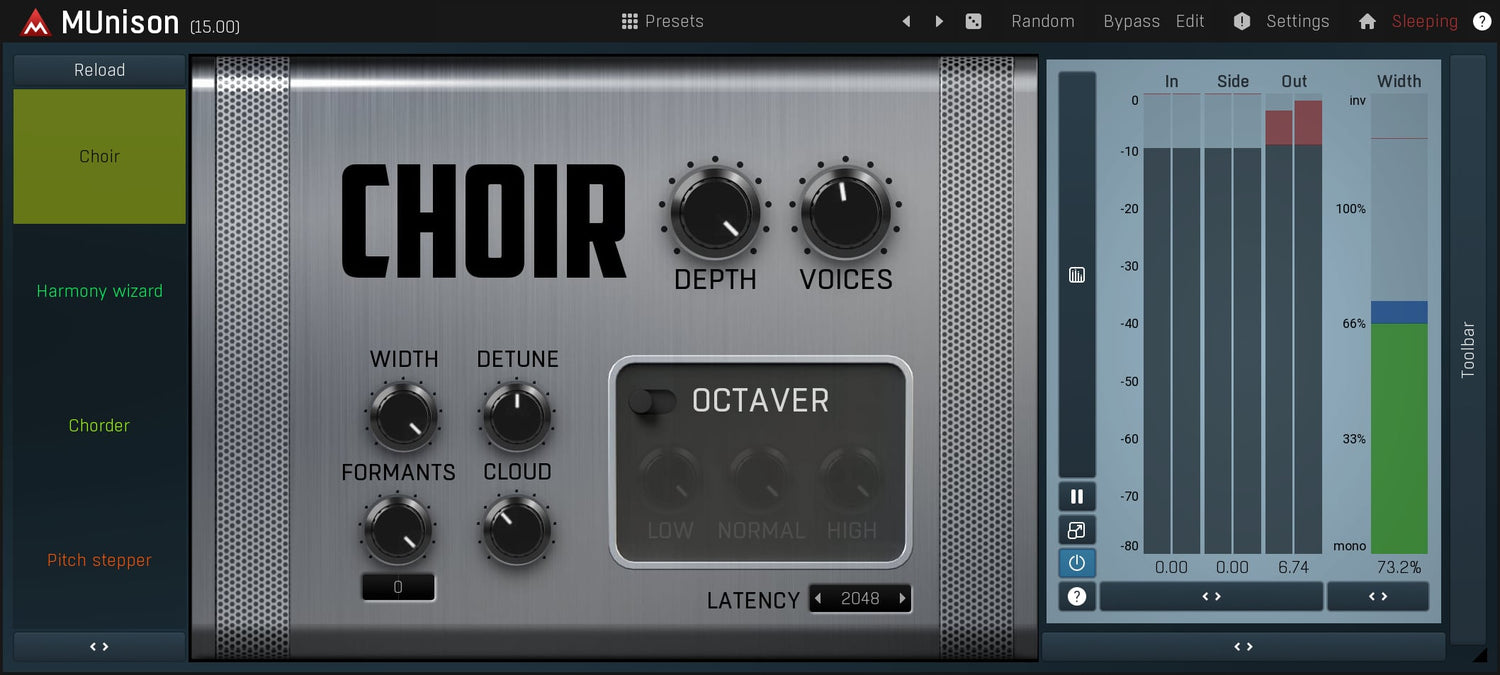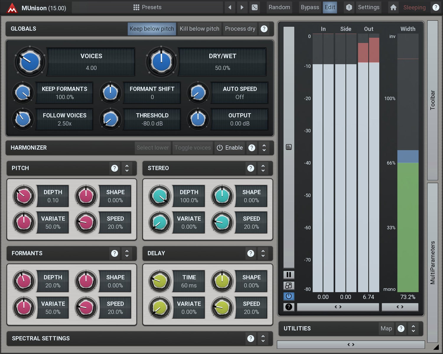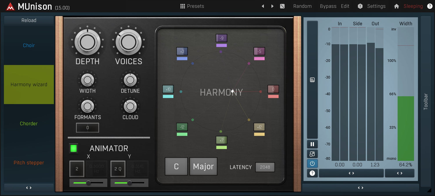 MUnison is a unique combination of doubler/unison and smart harmonizer. It lets your vocals sound like an orchestra with automatically scaled harmonies, produces classic double-tracking effect and much more.