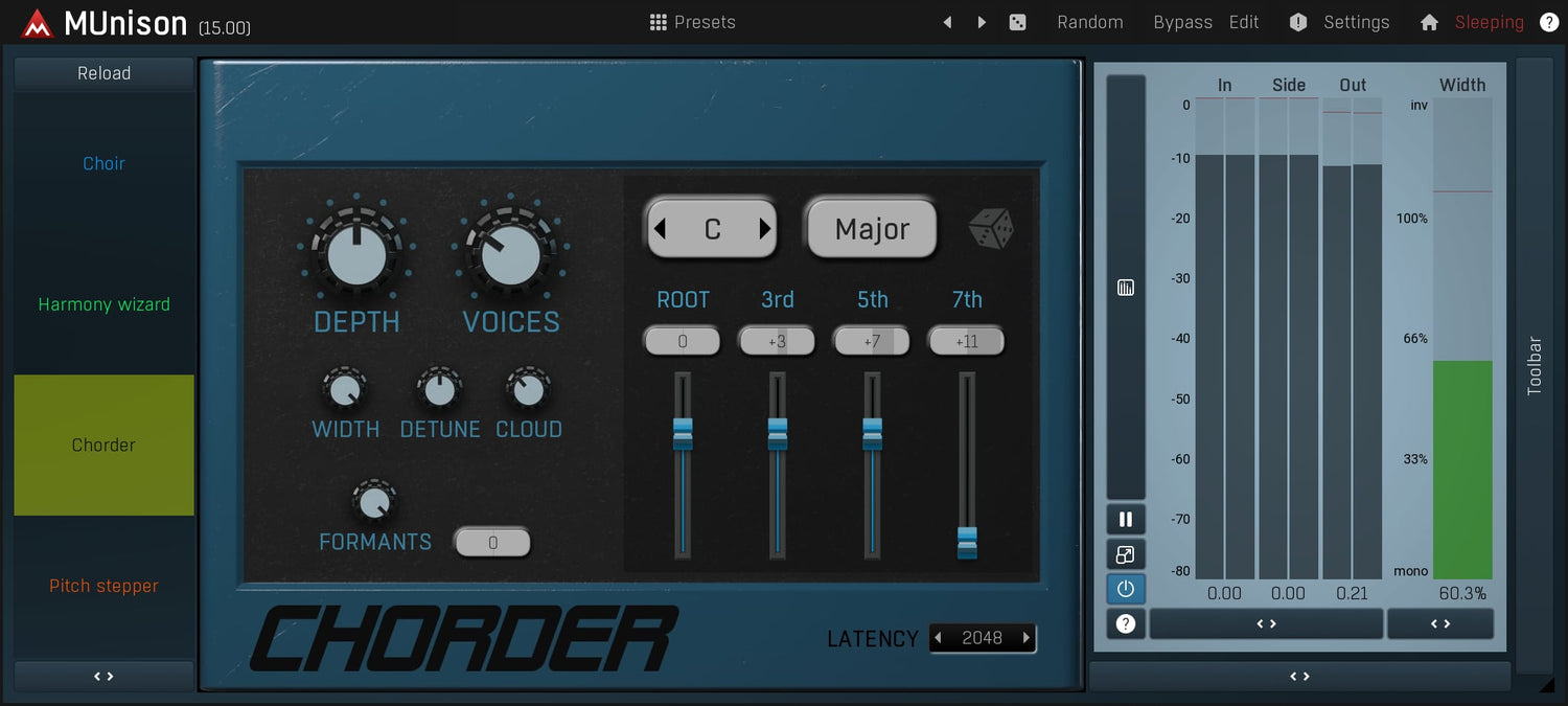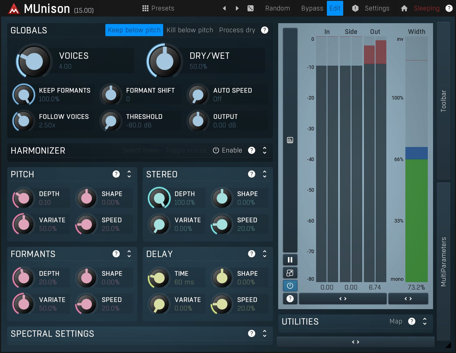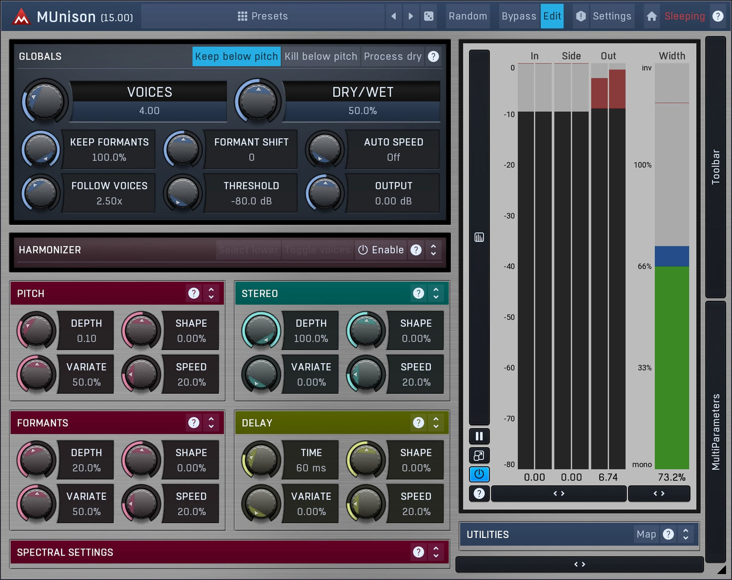 MUnison is a unique combination of doubler/unison and smart harmonizer. It lets your vocals sound like an orchestra with automatically scaled harmonies, produces classic double-tracking effect and much more.