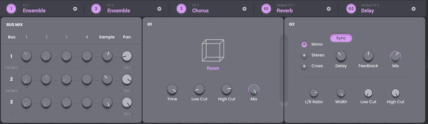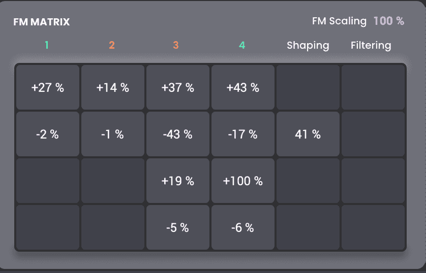Using four FM operators and an FM operator matrix, you can craft almost any FM sound you’ve ever heard—or even those you haven’t heard of yet! You can adjust the values of each operator using specific on-screen controls for pulse width, formant, FM filtering, and FM shaping, as well as specific ADSR and FM oscillator envelope controls.