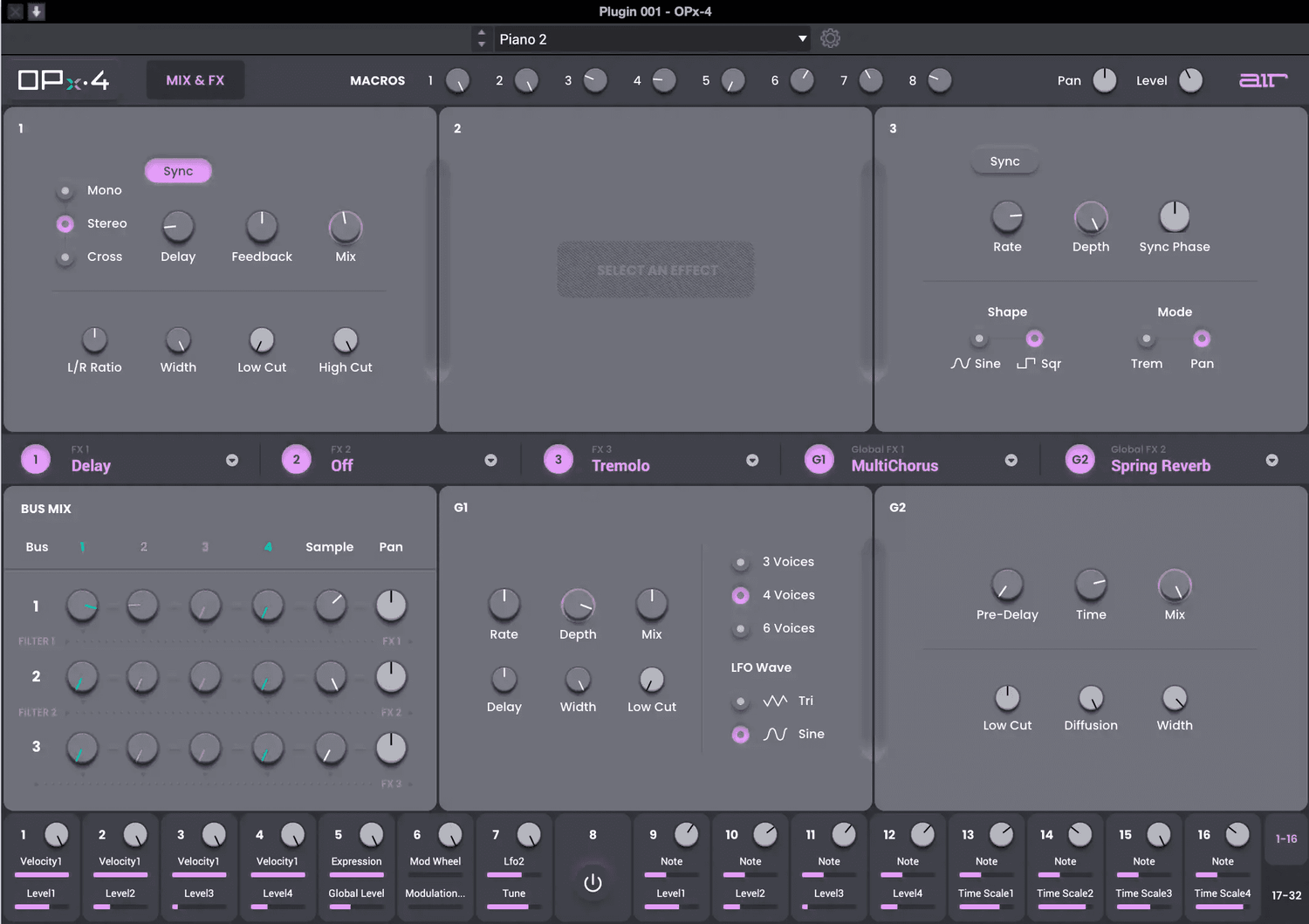 OPx-4 includes multiple effects like EQ, amp sims, reverb, delay, and modulation. Create brilliant shimmers, dark haunting echoes, or spacey washed-out DX-style electric pianos with a cutting-edge effects engine built right into the instrument.