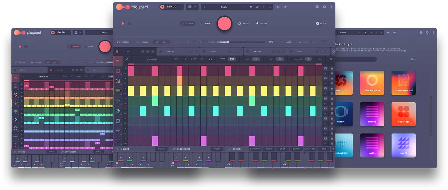 Intelligentes Design Im Gegensatz zu anderen Groove-Generatoren, die auf einen bestimmten Algorithmus beschränkt sind, setzt Playbeat auf Innovation durch den Einsatz fortschrittlicher lokaler KI-Algorithmen, um völlig originelle Grooves zu erstellen oder zu remixen, die sich nie wiederholen und immer großartig klingen!