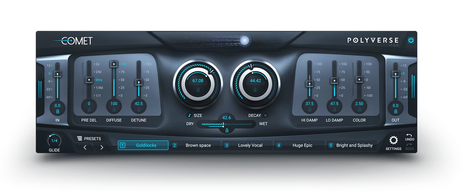 Ein Hall mit unvergleichlicher Üppigkeit und Vielseitigkeit. Umhüllen Sie Ihren Sound mit atemberaubenden Texturen von unglaublicher Klarheit, während Sie mit Comets einzigartigen Preset-Morphing-Fähigkeiten in Echtzeit lebendige, atmende Räume schaffen.