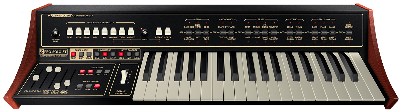 - Massive dual-layer voicing architecture with 16 polyphonic voices per layer: two different Pro Soloist style sounds simultaneously playable, in either a keyboard split or stacked layer mode, with discrete controls for layer volume and panning