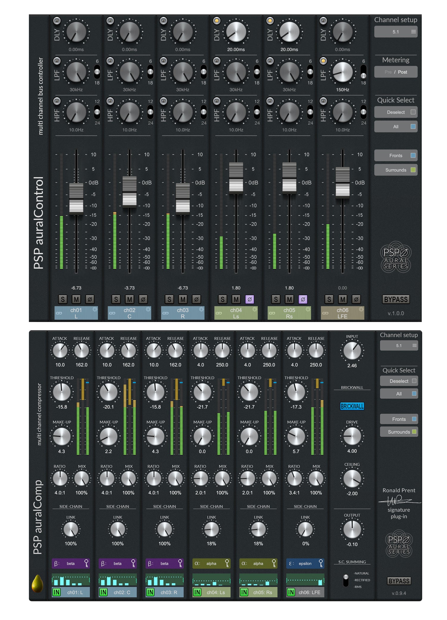PSP auralControl (AAX, VST3, AudioUnit) ist ein essentielles Werkzeug für das Mehrkanal-Tracking, Mischen und Mastering. Ziel ist es, die Lautstärke, Polarität, Bandbreite und Zeit für jeden einzelnen Kanal im Mehrkanal-Set individuell anzupassen.